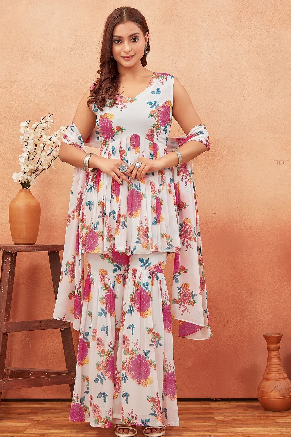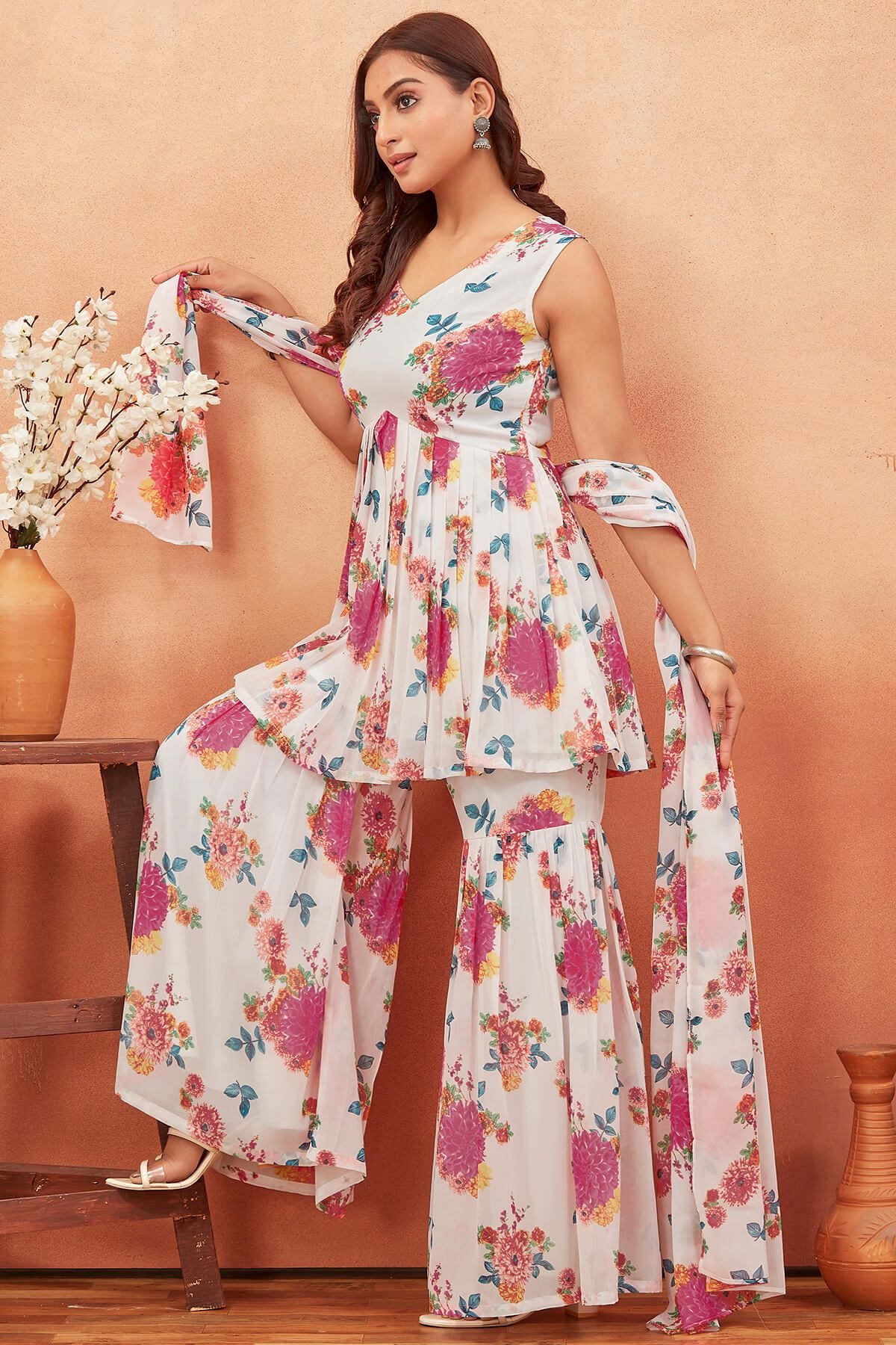 Size ChartKurta design: Floral printed V-neck Sleeveless Above knee length with flared hem Georgette machine weave fabric Sharara design: Printed Sharara Partially elasticated waistband Slip-on closure