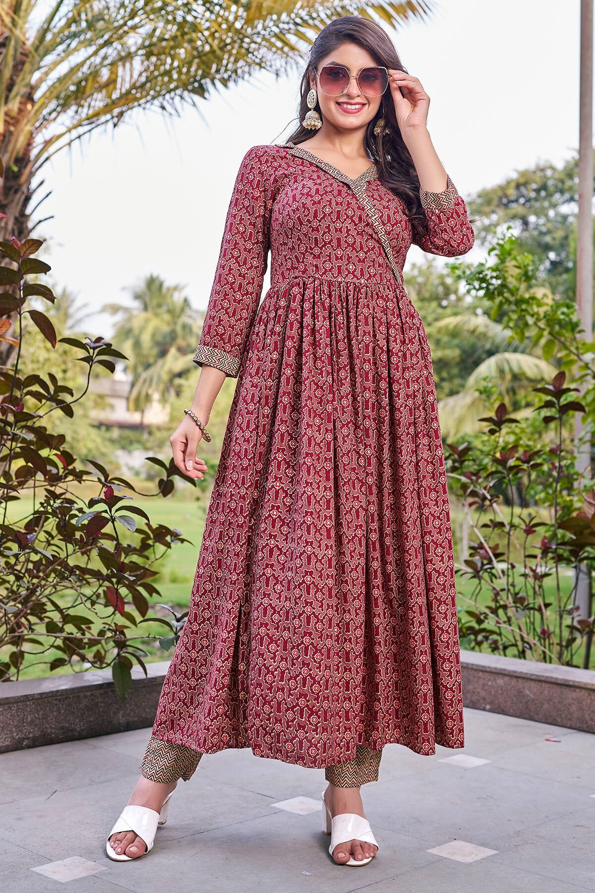Size ChartKurta design: Floral printed Anarkali shape Angrakha style V-neck, three-quarter regular sleeves Na pockets Calf length length with flared hem Viscose rayon machine weave fabric Trousers design: Printed Trousers Elasticated waistband Slip-on closure