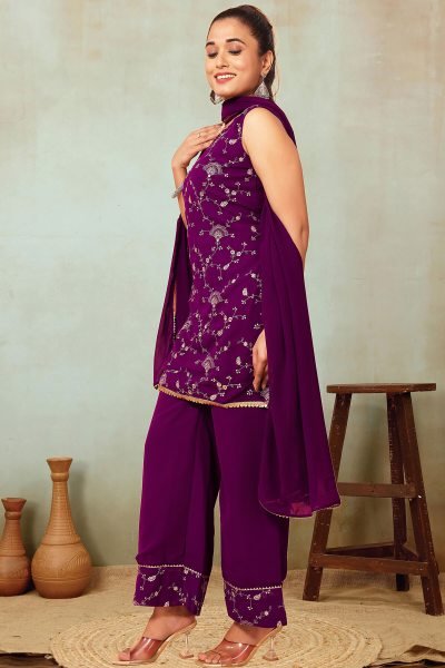 Size ChartBURGUNDY EMBROIDERY WORKED KURTA WITH PLAZZO AND DUPATTA. ROUND NECK. SLEEVELESS. SLIP ON CLOSURE.