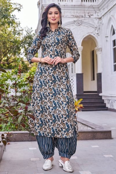 Size ChartKurta design: Floral printed Straight shape Regular style Shirt collar, three-quarter regular sleeves Na pockets Calf length length with straight hem Viscose rayon machine weave fabric Trousers design: Printed Trousers Elasticated waistband Slip-on closure