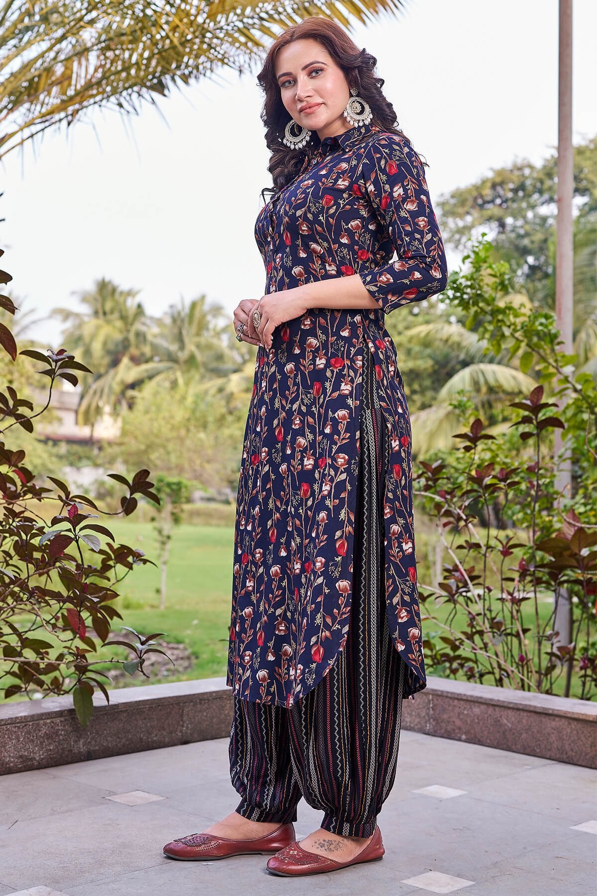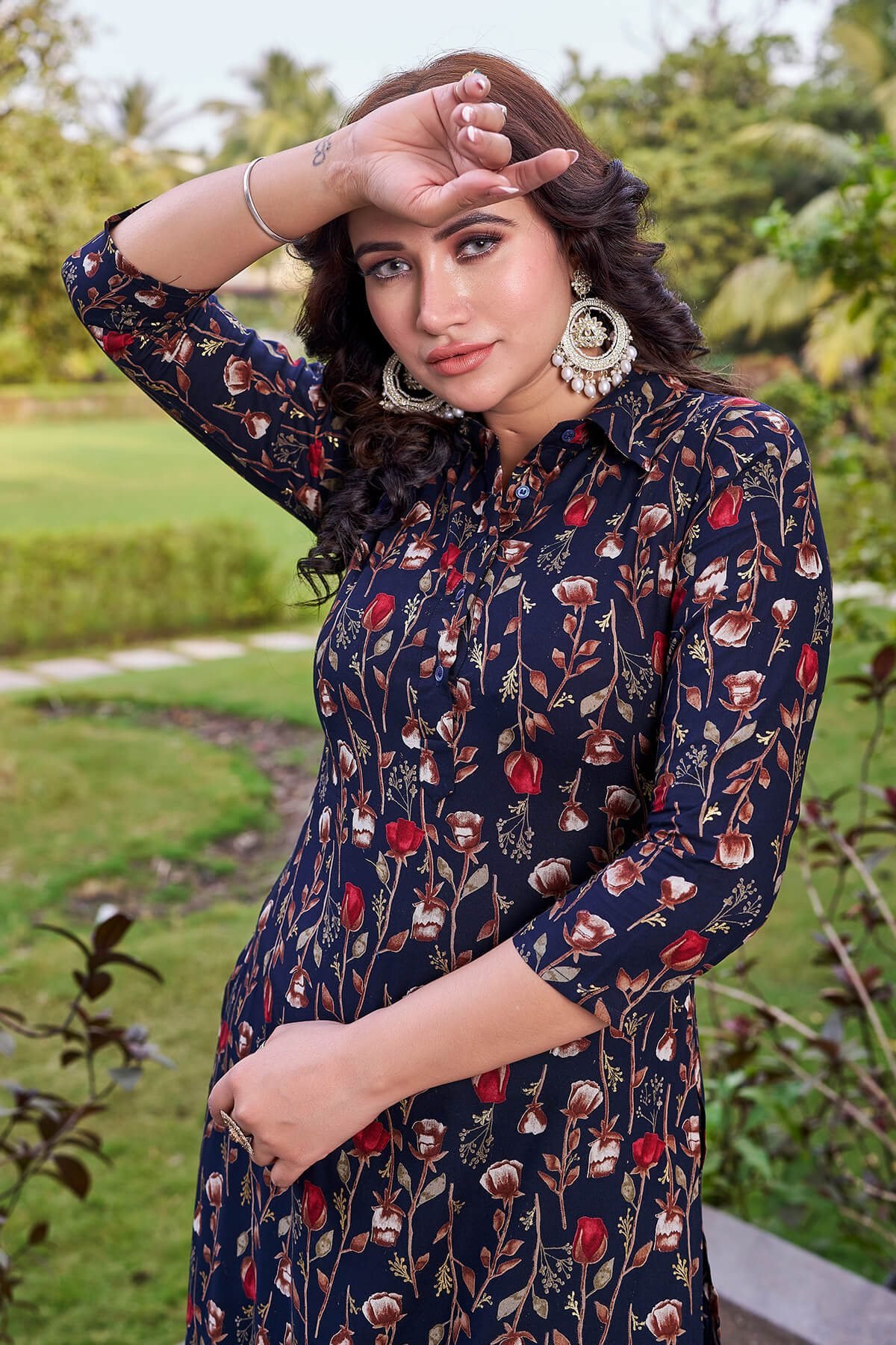Size ChartKurta design: Floral printed Straight shape Regular style Shirt collar, three-quarter regular sleeves Na pockets Calf length length with straight hem Viscose rayon machine weave fabric Trousers design: Printed Trousers Elasticated waistband Slip-on closure
