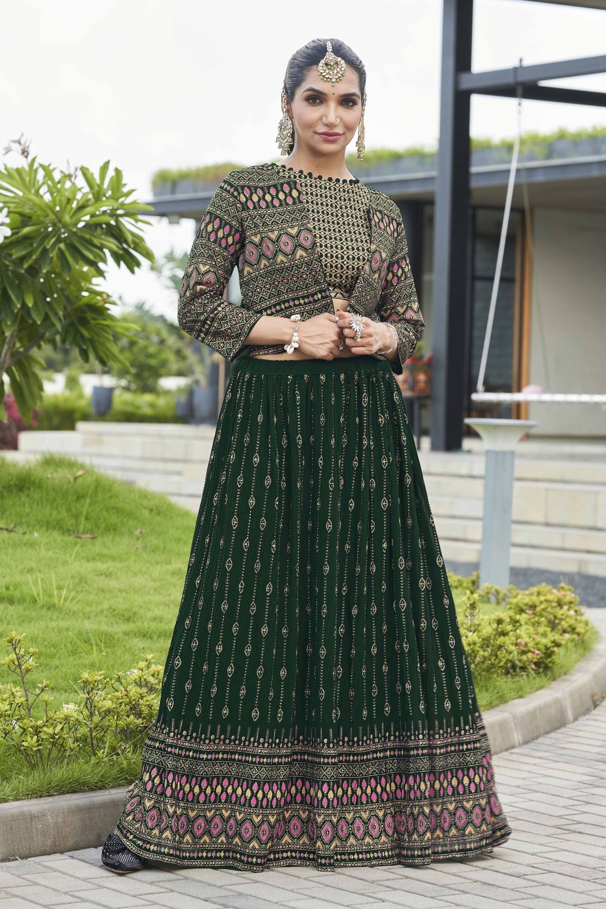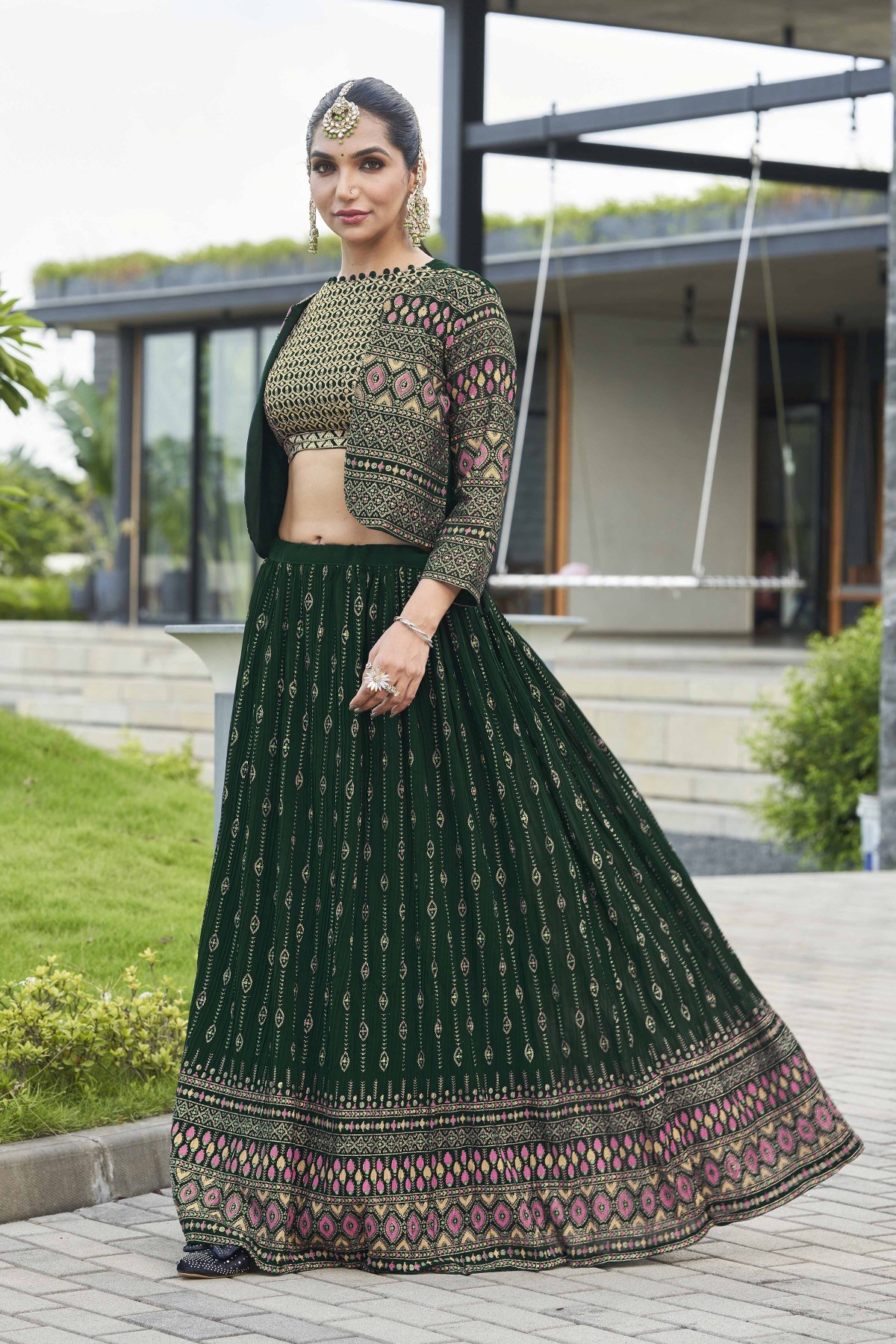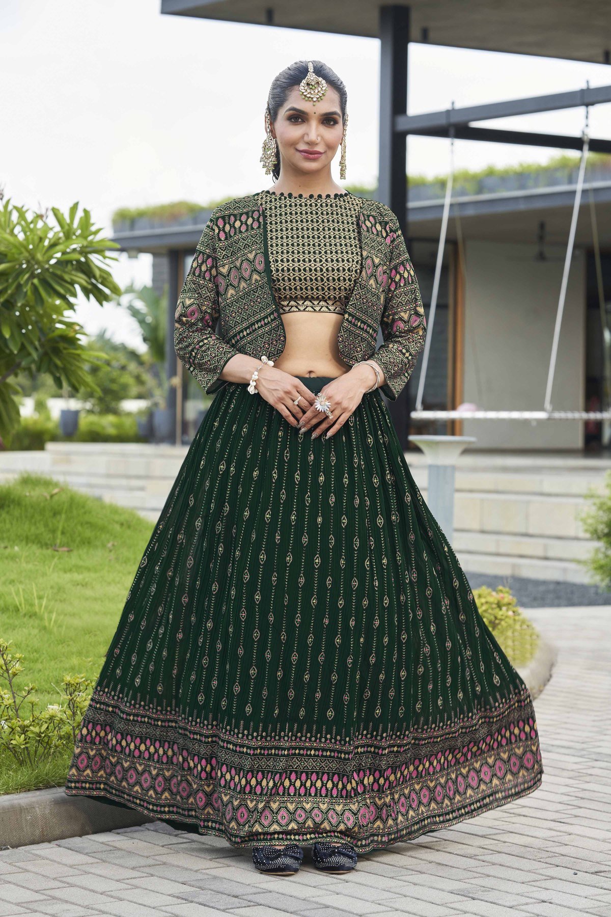 Bottle Green Lehenga Choli With Jacket