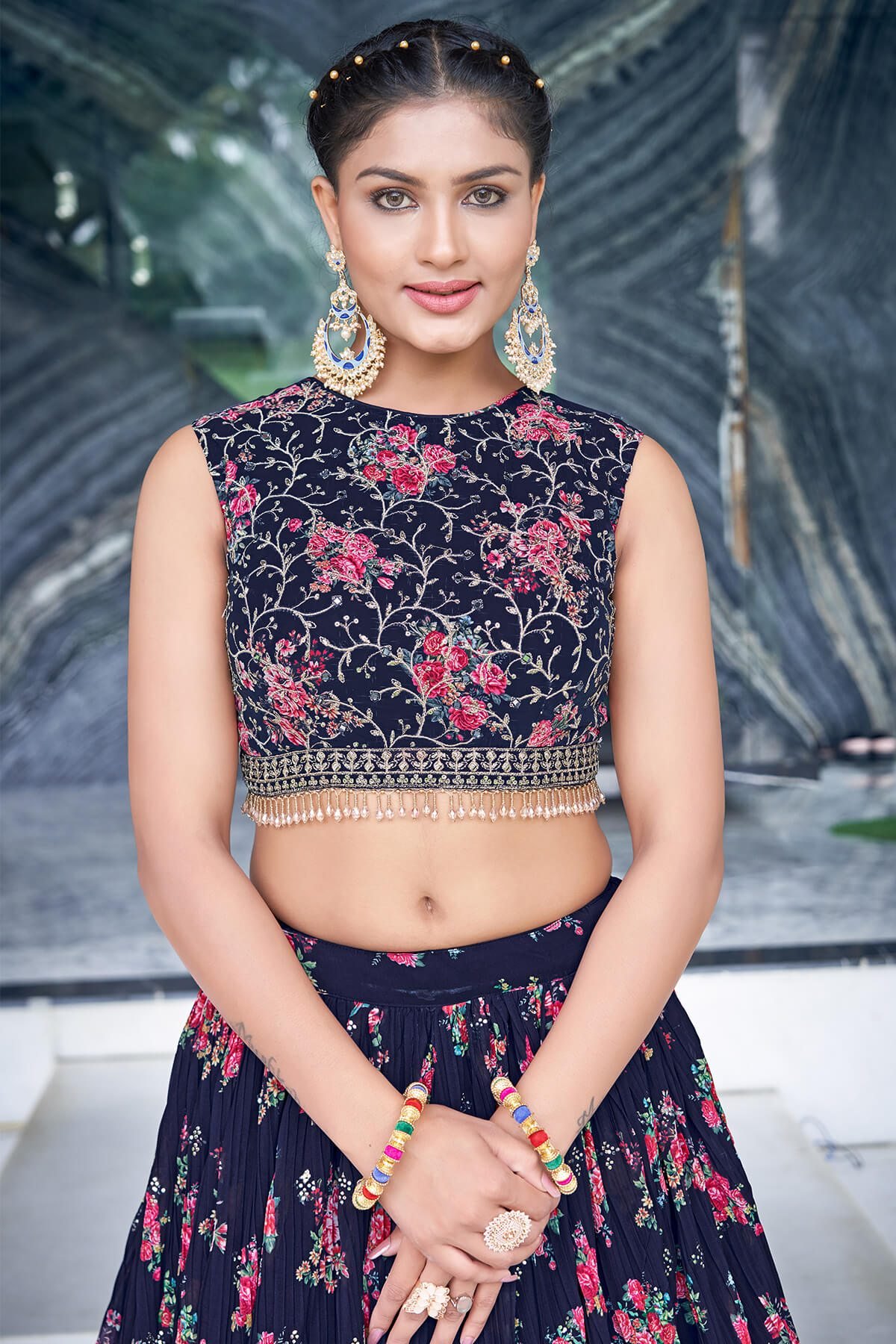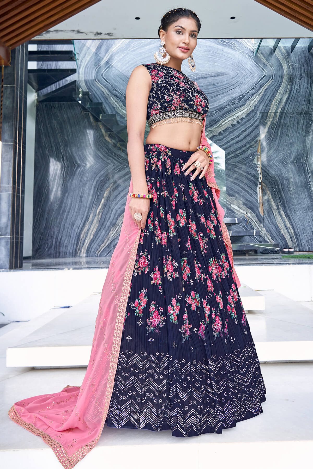 Size ChartLEHENGA: DIGITAL PRINTED MUKEISH WORKED GEORGETTE. BLOUSE: DIGITAL PRINTED JARI, SEQUINS AND PURE MIRROR WORKED GEORGETTE. DUPATTA: JARI AND SEQUINS EMBROIDERY WORKED GEORGETTE. TIE CLOSURE BLOUSE. ZIP AND TIE CLOSURE LEHENGA.