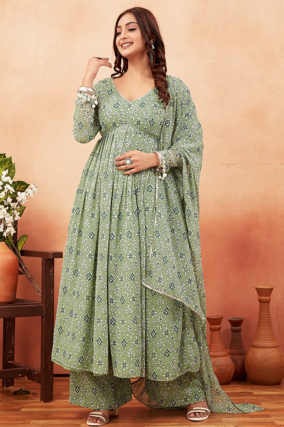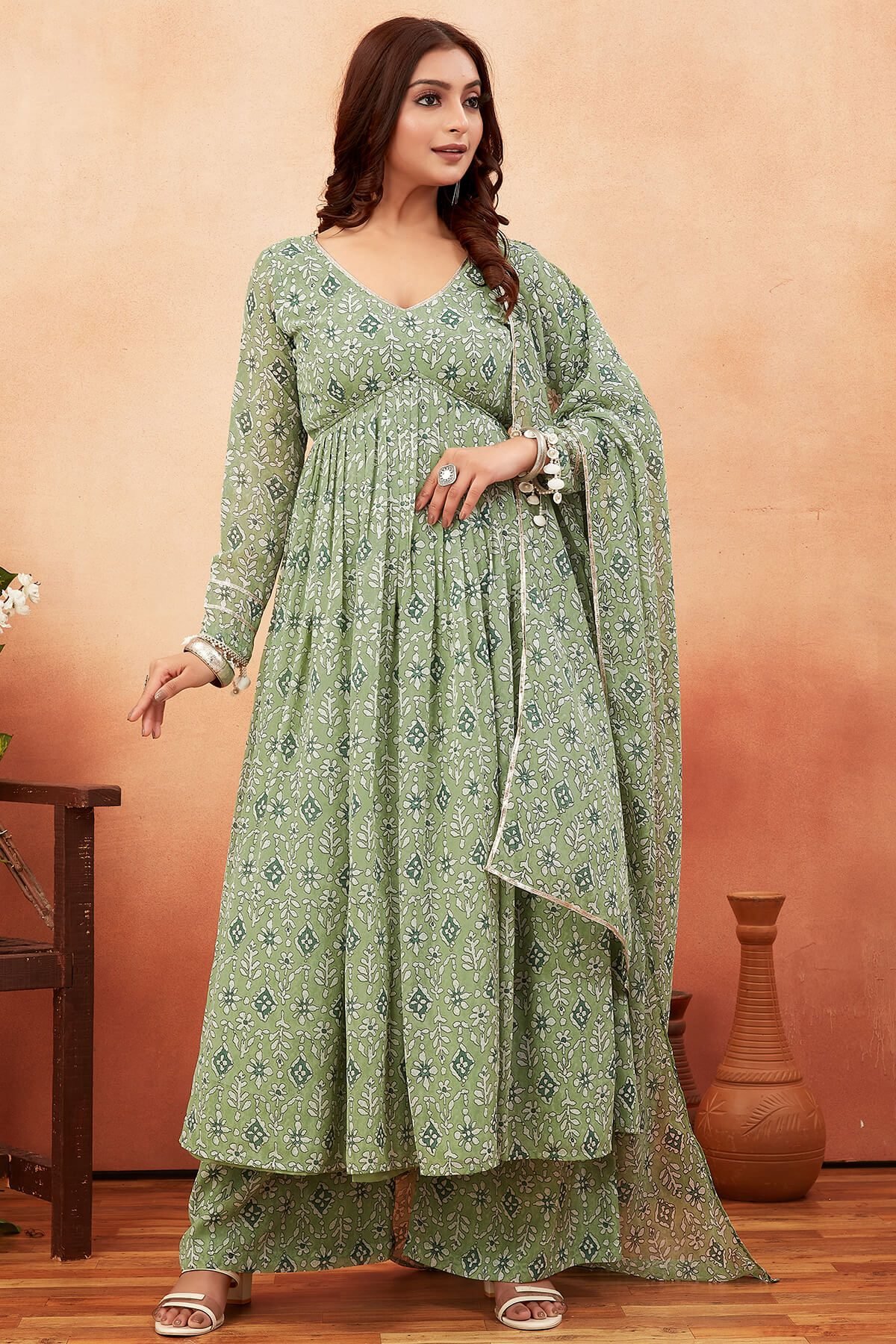 Size ChartKurta design: Floral printed Anarkali shape Regular style V-neck, long regular sleeves Na pockets Calf length length with flared hem Poly georgette machine weave fabric Palazzos design: Printed Palazzos Elasticated waistband Slip-on closure Dupatta: Printed Taping border
