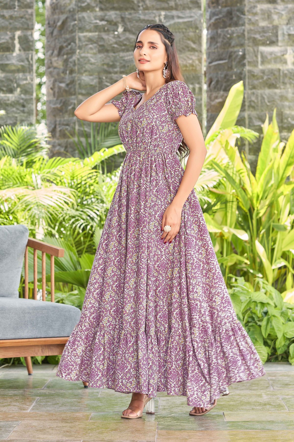 Size ChartMauve floral print fit & flare dress Sweetheart neck Short, puff sleeve Gathered or pleated detail Maxi length in flared hem Cotton fabric Concealed zip closure