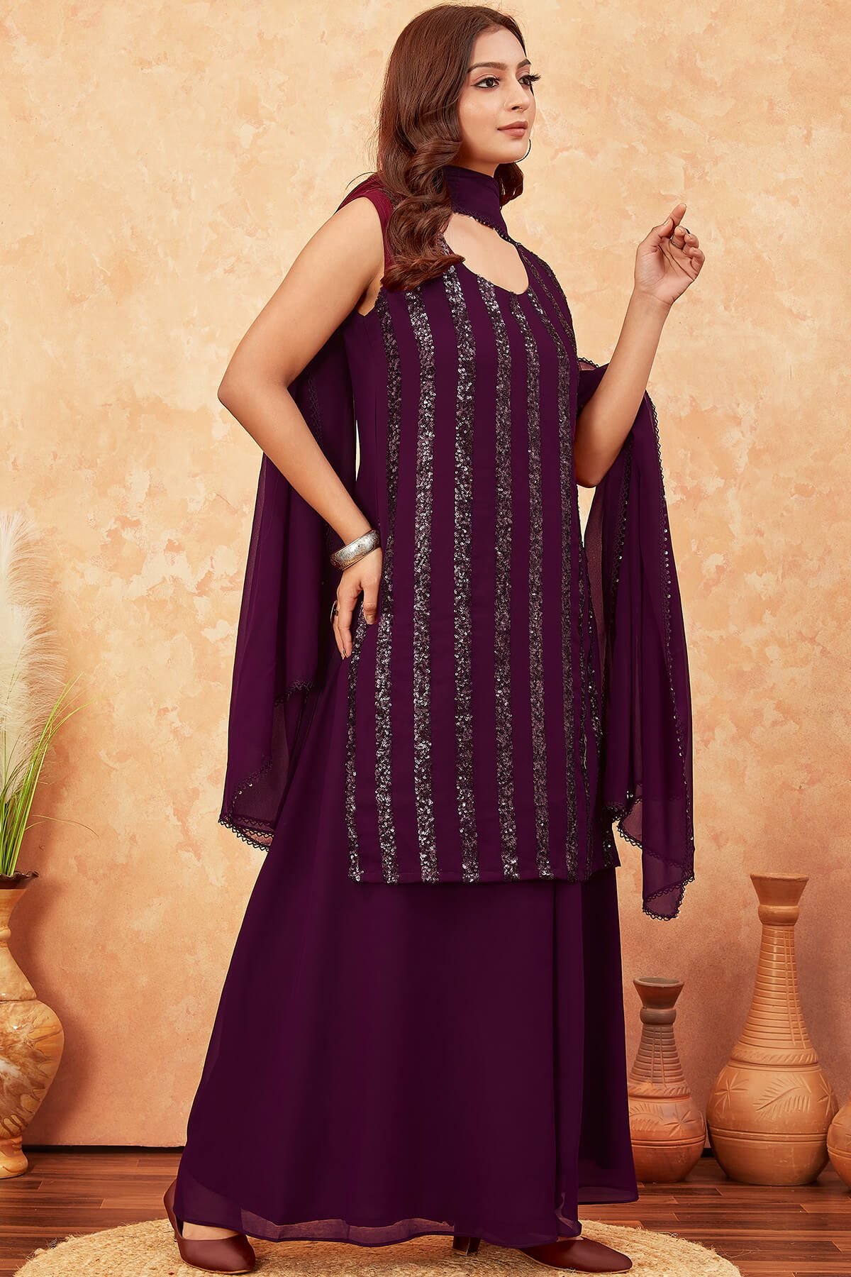 Size ChartBURGUNDY SEQUINSED WORKED KURTA WITH FLAIRED PLAZZO AND DUPATTA. ROUND NECK. SLEEVELESS. HALF BELT HALF ELASTIC SLIP ON PLAZZO.